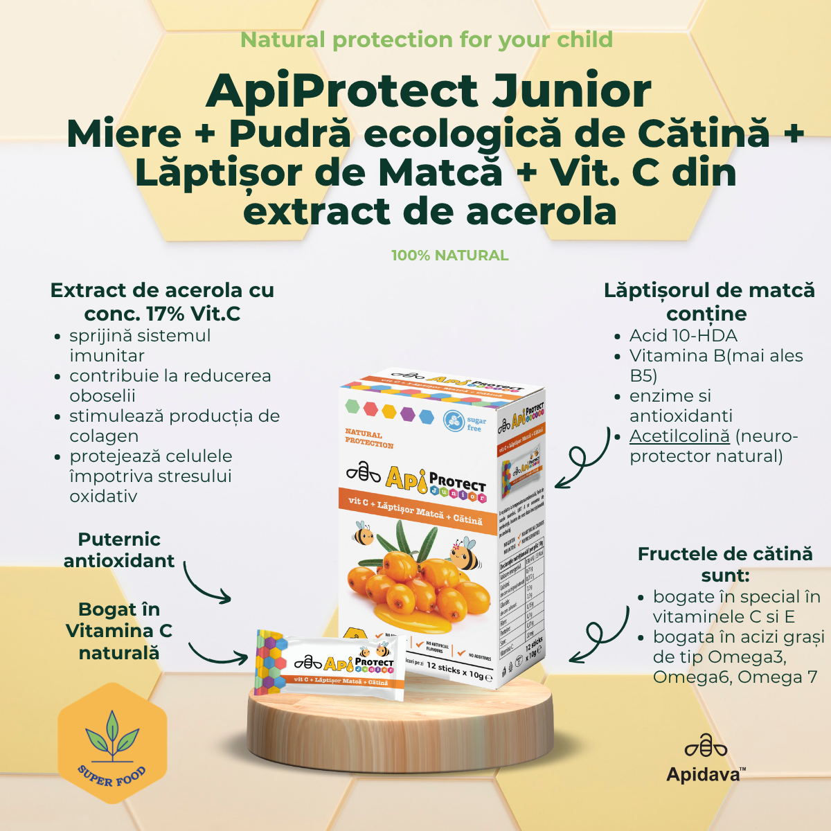 Lăptișorul de matcă crud utilizat in Apiprotect Junior este recunoscut pentru compoziția sa complexă avand proprietati antioxidante, antiinflamatorii, imunomodulatoare și neuroprotectoare.