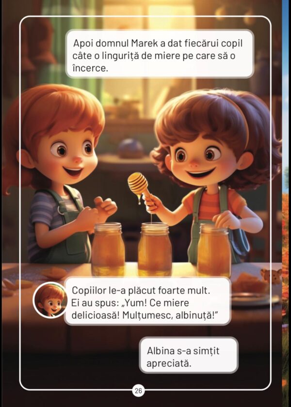 Albina noastra prietena” este un basm educativ care îi poartă pe cei mici în lumea fermecată a stupului, iar copii afla cum transforma o albina nectarul in miere. Aceasta poveste plina de culoare, aventură și emoție îi învață pe copii respectul pentru albine, natura si faptul ca fiecare creatura are propria sa valoarea si rol in natura.