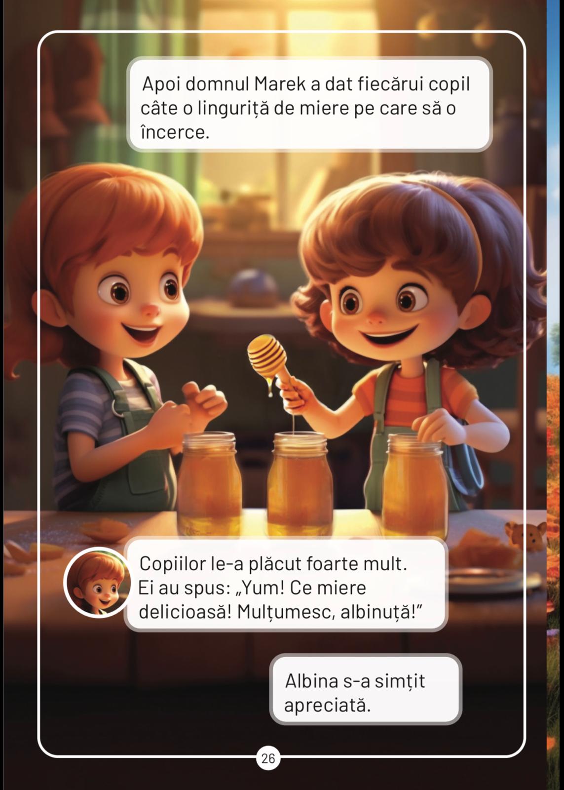 Albina noastra prietena” este un basm educativ care îi poartă pe cei mici în lumea fermecată a stupului, iar copii afla cum transforma o albina nectarul in miere. Aceasta poveste plina de culoare, aventură și emoție îi învață pe copii respectul pentru albine, natura si faptul ca fiecare creatura are propria sa valoarea si rol in natura.