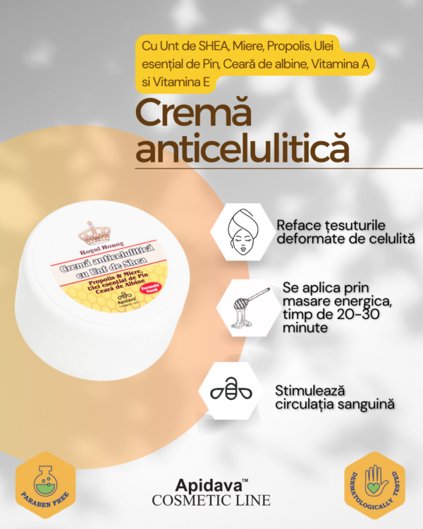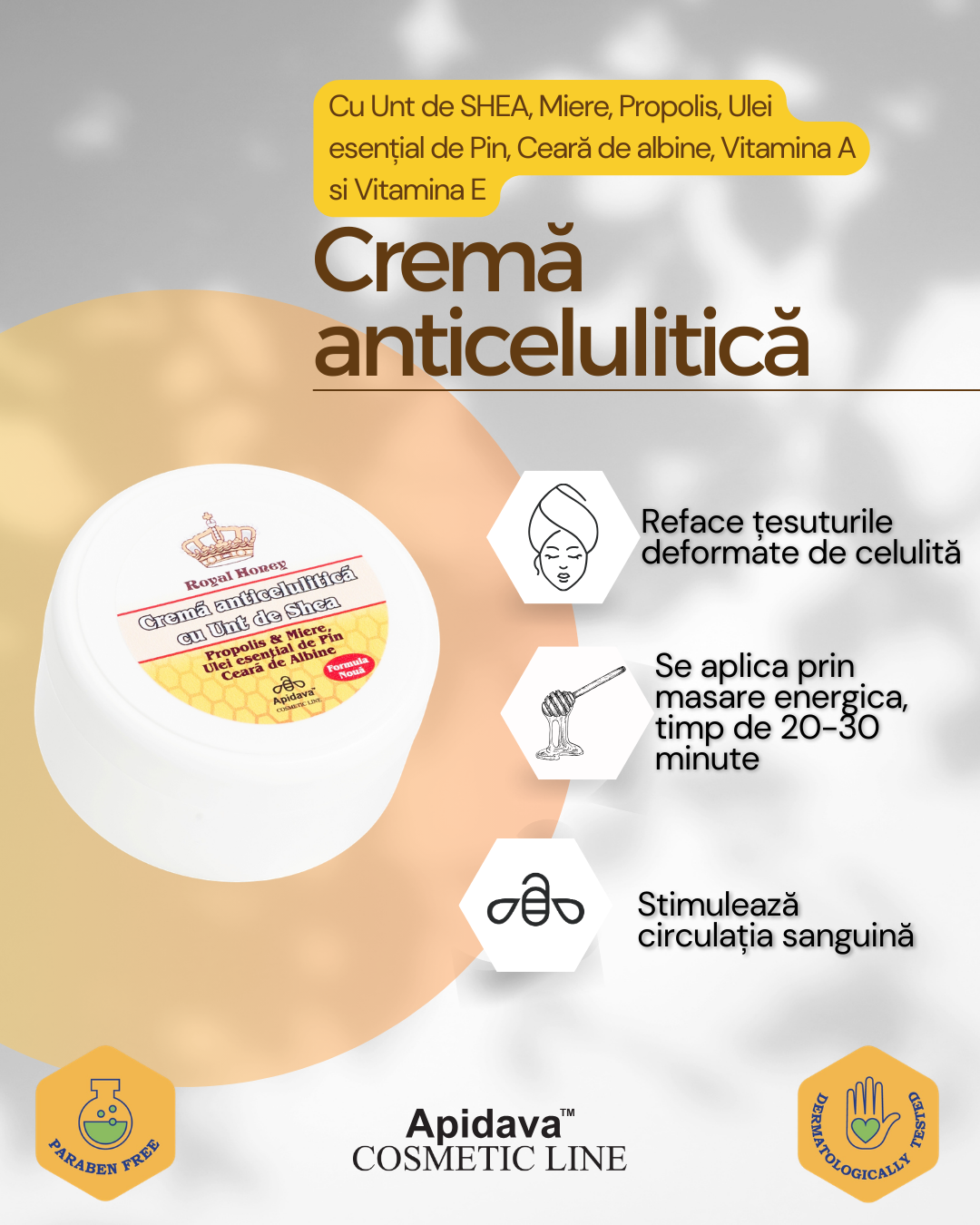 Combinaţia de Propolis, Ulei de Pin şi Extract de Salcâm este un tratament foarte eficient împotriva celulitei, cu efect de stimulare a microcirculaţiei locale Propolisul este un produs 100% natural cu un conţinut foarte bogat în antioxidanţi naturali, care ajută corpul la eliminarea toxinelor. Uleiul esenţial de Pin are calitatea deosebită de stimulare a circulaţiei sangvine şi a tonusului muscular. Are acţiune locală de încălzire a pielii cu rol de ardere a grăsimilor. Crema anticelulitică este ideală pentru un masaj prelungit care tonifică pielea şi reduce apariţia aspectului de coaja de portocală.