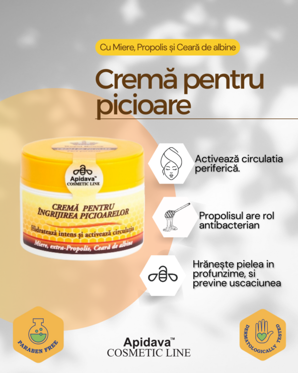 Ceara de albine este un emolient 100% natural care va hrăni pielea în profunzime; iar propolisul are rol antibacterian – esenţial pentru îngrijirea corectă a picioarelor.