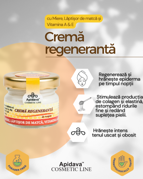 Crema regenerantă este o cremă nutritivă de noapte folosită pentru îngrijirea ridurilor încă de la primele semne de apariţie.