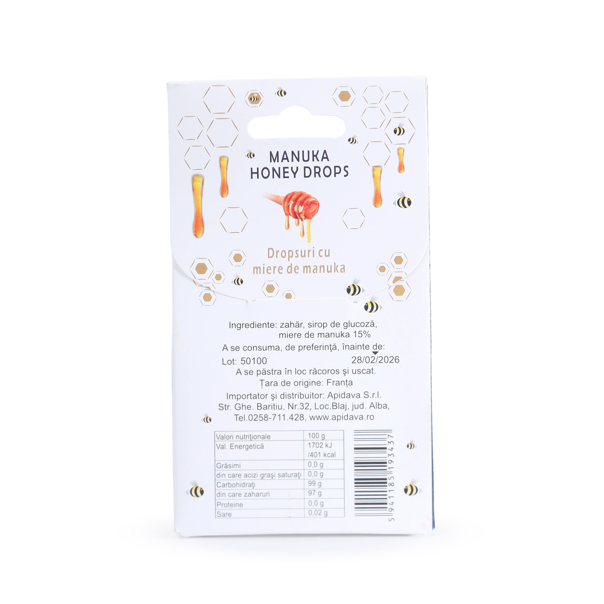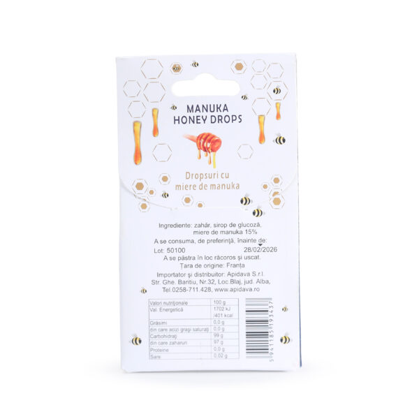 Ingrediente: zahăr, sirop de glucoză, miere de manuka 15%.