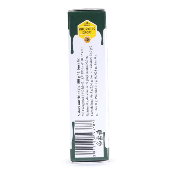 Ingrediente: zahăr, sirop de glucoză, miere 10,5%, acid citric, extract uscat de propolis 0,13%, arome naturale de pin, arome naturale.