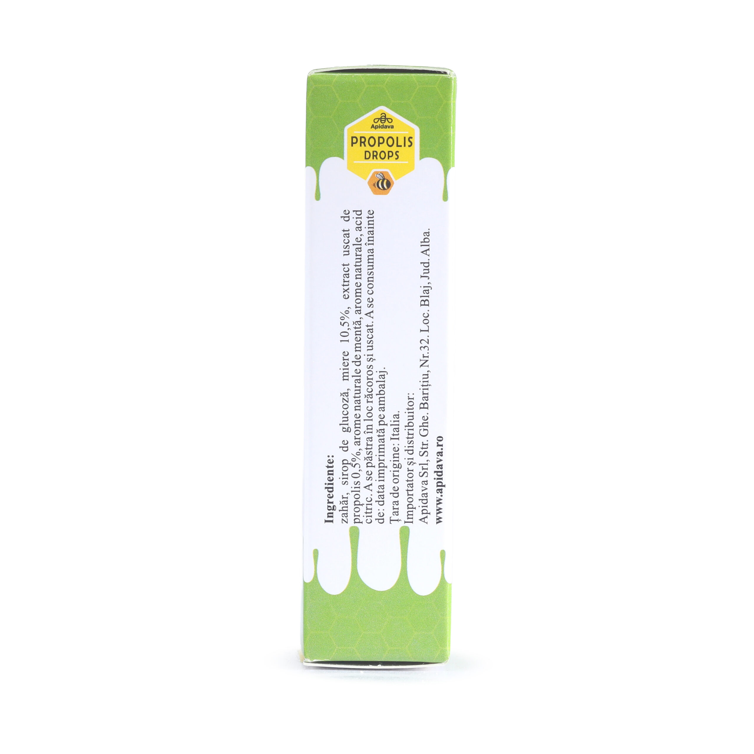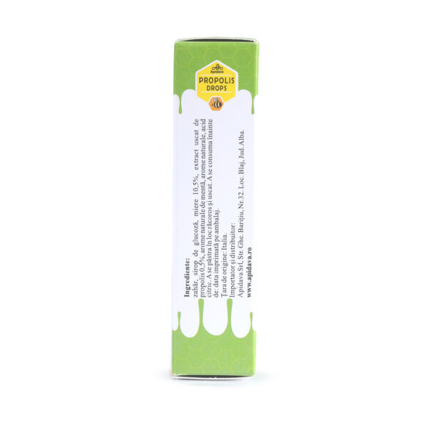 Ingrediente: zahăr, sirop de glucoză, miere 10,5%, extract uscat de propolis 0,5%, arome naturale de mentă, arome naturale, acid citric.