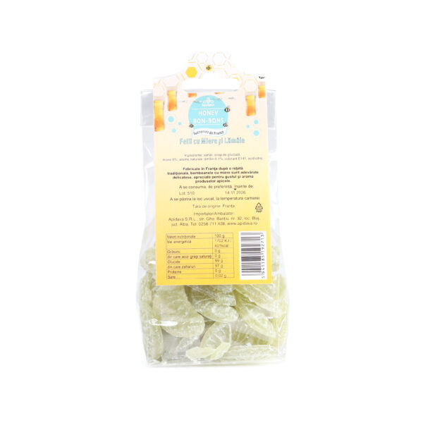 Ingrediente: zahăr, sirop de glucoză, miere 5%, ulei arome naturale de lămâie 0,1%, colorant pentru uz alimentar E141, acid citric.
