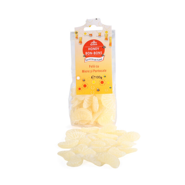 Ingrediente: zahăr, sirop de glucoză, miere 5%, arome naturale de portocale 0,1%, acid citric.