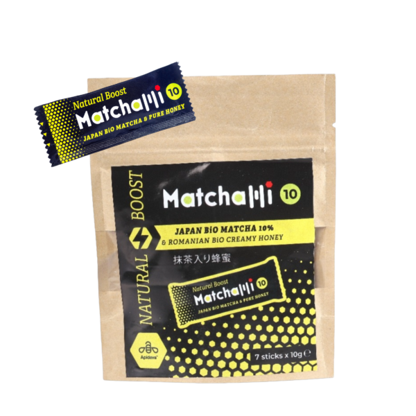 Conținutul unui plic: 9 grame miere și 1 gram pudră mactcha organică, origine Japonia