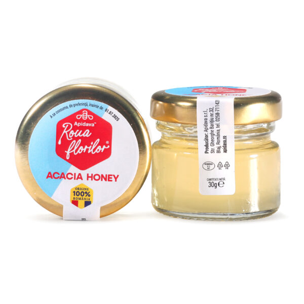 Borcănaș de 30 grame cu Miere de Salcâm obţinută din florile de salcâm şi se caracterizează prin faptul că are o remarcabilă puritate şi claritate.