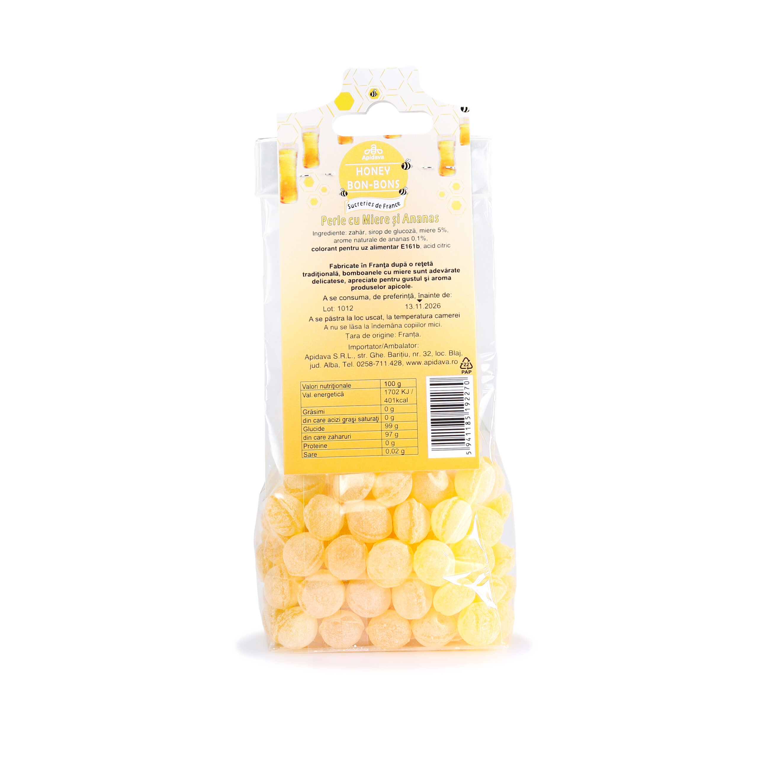 Ingrediente: zahăr, sirop de glucoză, miere 5%, ulei arome naturale de ananas 0,1%, colorant pentru uz alimentar E161b, acid citric.