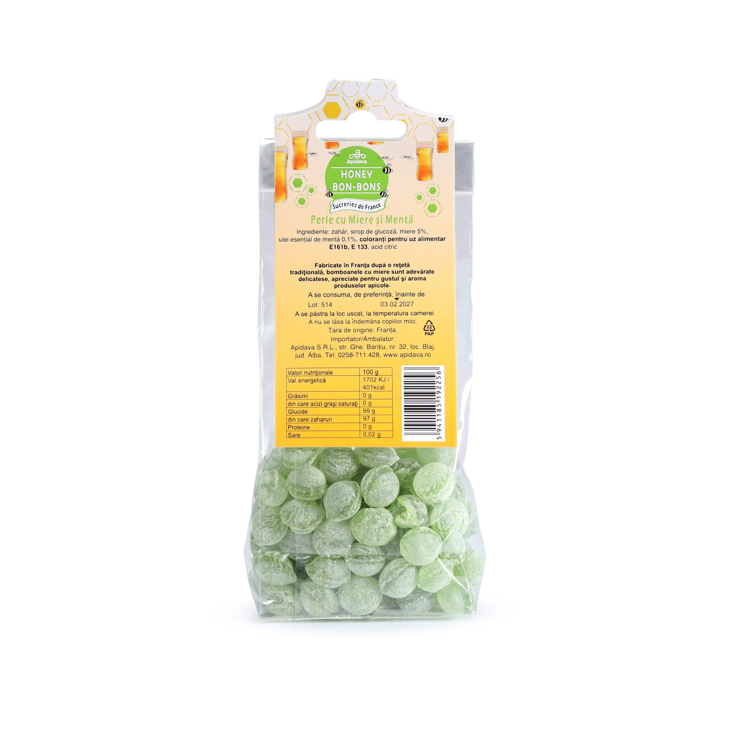 Ingrediente: zahăr, sirop de glucoză, miere 5%, ulei esențial de mentă 0,1%, coloranți pentru uz alimentar E161b, E133, acid citric.